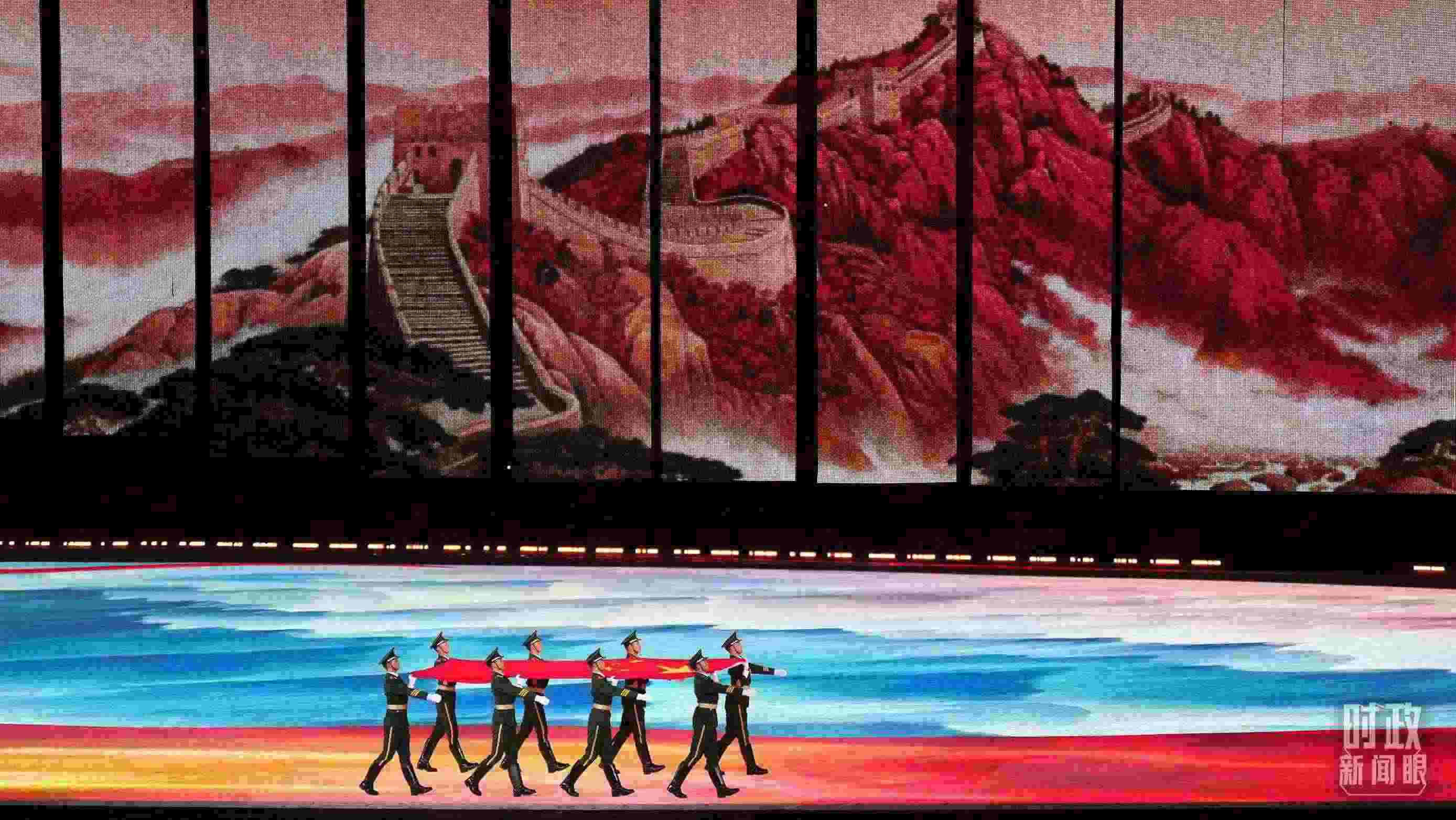 △踏著紅綢鋪就的道路,五星紅旗入場。(總臺(tái)央視記者魏幫軍、國廣記者李晉拍攝)