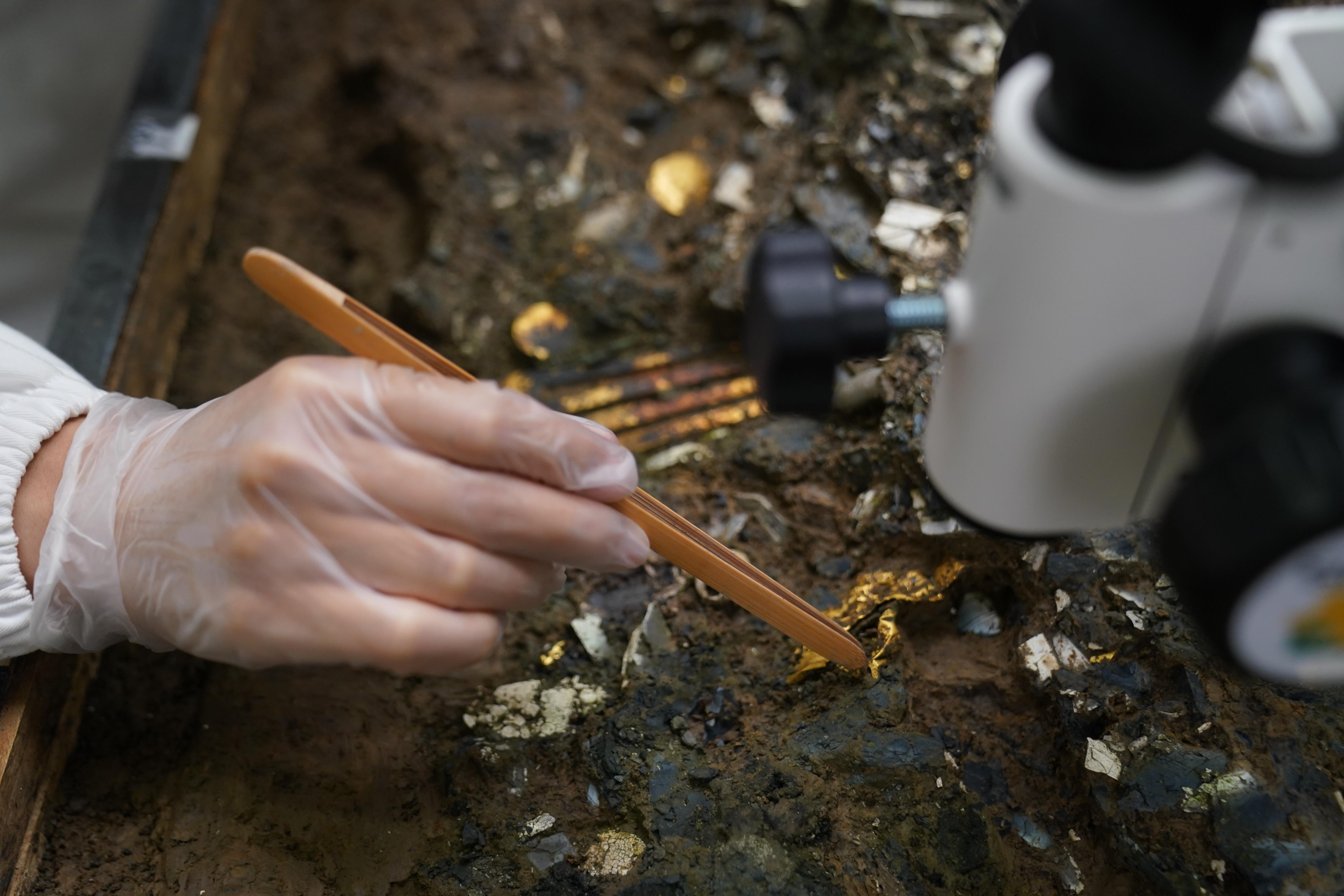 △三星堆博物館文物保護(hù)修復(fù)館內(nèi),三星堆文物修復(fù)人員正在對(duì)出土文物進(jìn)行清理。(總臺(tái)國廣記者李晉拍攝)