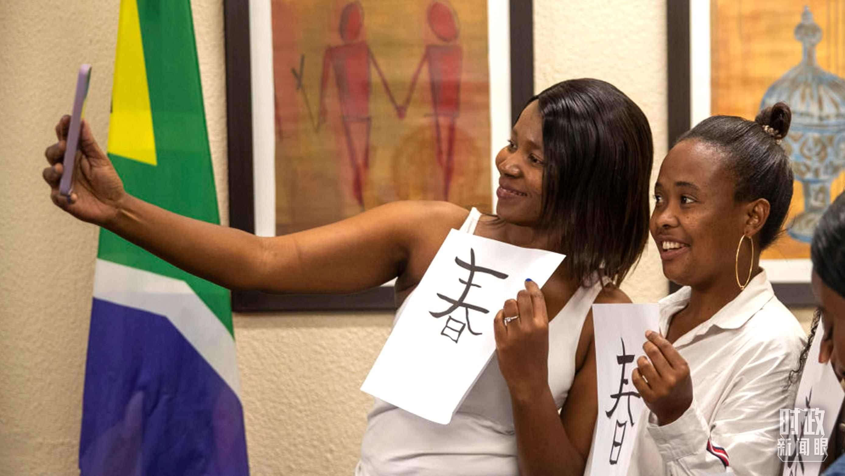 △南非學(xué)生與自己書寫的漢字合影。(資料圖)