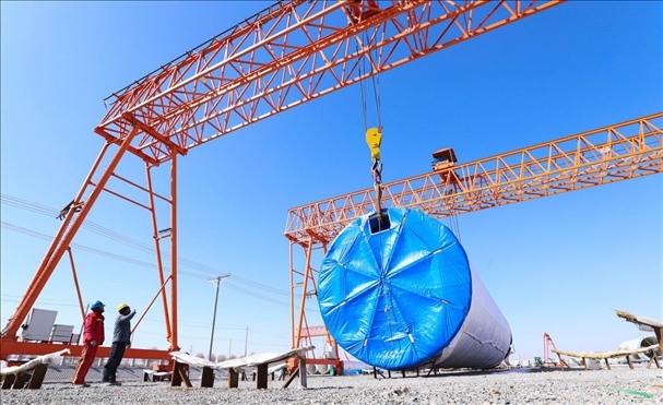 △ 2024年3月7日,甘肅省張掖市,工人們正在吊裝風(fēng)力發(fā)電機組塔筒,準(zhǔn)備運往安裝現(xiàn)場。