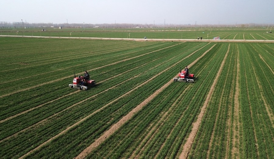 山東省汶上縣,農(nóng)民駕駛農(nóng)機(jī)在高標(biāo)準(zhǔn)農(nóng)田里進(jìn)行小麥春季管護(hù)作業(yè)(2024年3月13日攝,無(wú)人機(jī)照片)。新華社記者 徐速繪 攝