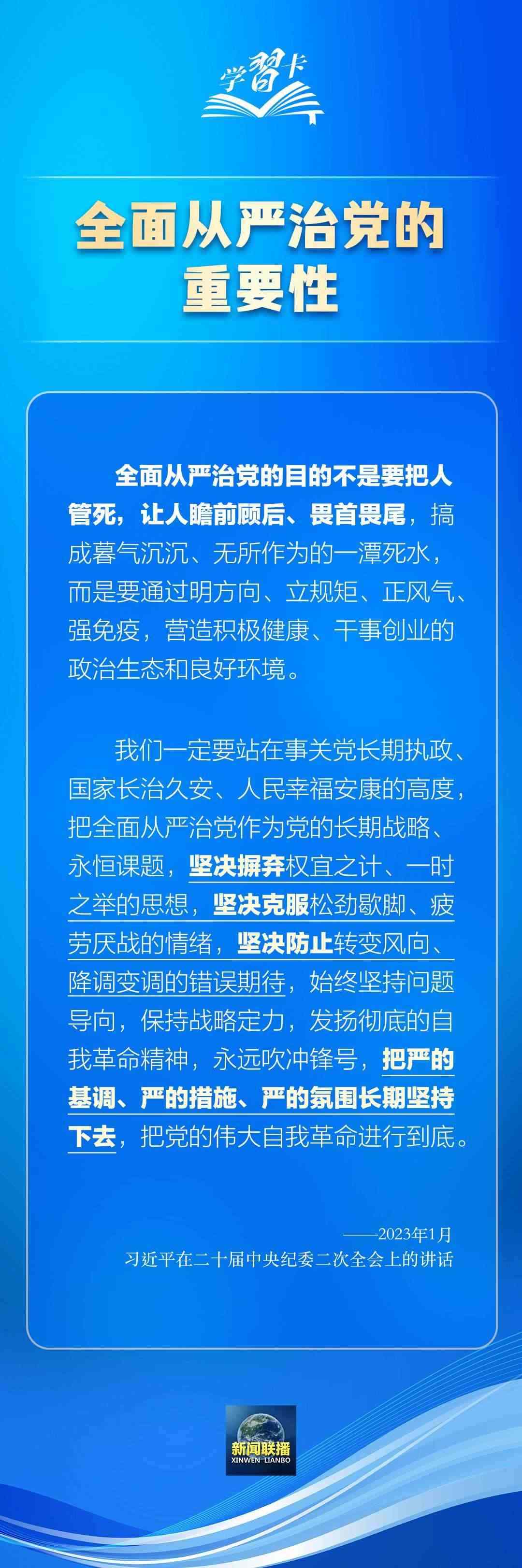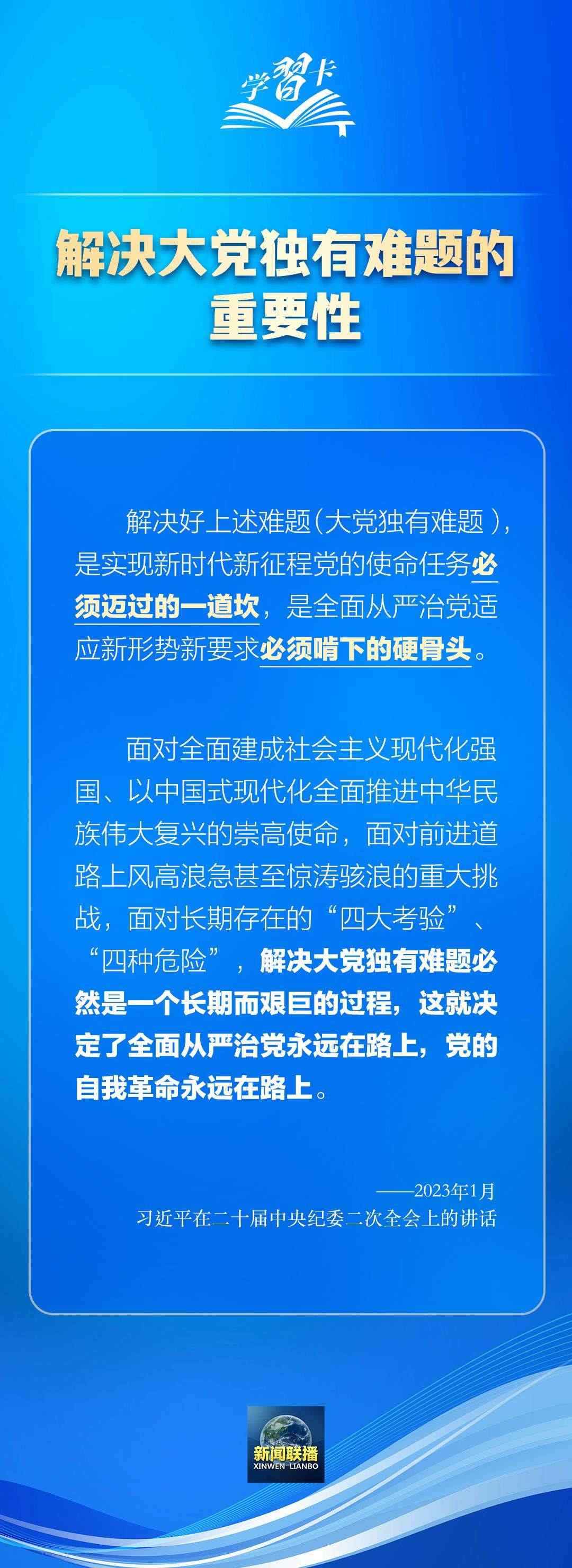 習(xí)近平總書(shū)記在不同場(chǎng)合多次強(qiáng)調(diào)全面從嚴(yán)治黨、黨的自我革命的重要性。解決好大黨獨(dú)有難題,是實(shí)現(xiàn)新時(shí)代新征程黨的使命任務(wù)必須邁過(guò)的一道坎,是全面從嚴(yán)治黨適應(yīng)新形勢(shì)新要求必須啃下的硬骨頭。
