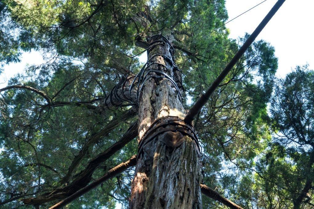 2024年8月12日在劍閣縣翠云廊拍攝的古樹(shù)“馬甲”,在樹(shù)干中部安裝碳纖維加固“馬甲”,與周邊樹(shù)木通過(guò)硬支護(hù)進(jìn)行彈性連接,可以有效保障樹(shù)體安全穩(wěn)固。新華社記者 唐文豪 攝