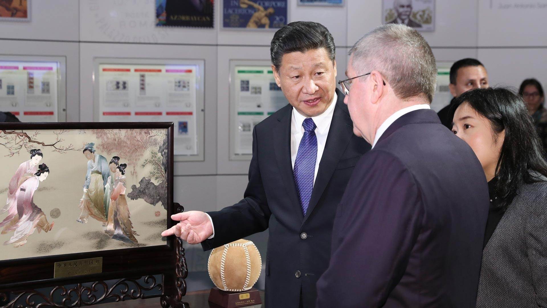 2017年1月,習(xí)近平主席在訪問(wèn)瑞士期間專程來(lái)到坐落在洛桑半山腰的國(guó)際奧林匹克博物館。這是中國(guó)國(guó)家元首首次到訪。習(xí)近平主席代表中國(guó)向國(guó)際奧委會(huì)贈(zèng)送了蘇繡《仕女蹴鞠圖》,并在留言簿上用中文寫下:“弘揚(yáng)奧運(yùn)精神,促進(jìn)和平發(fā)展”。