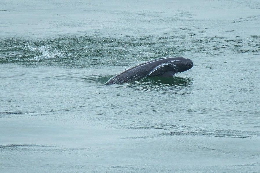 長(zhǎng)江江豚在湖北省宜昌市葛洲壩下游水域逐浪嬉戲(2024年5月21日攝)。新華社記者 肖藝九 攝