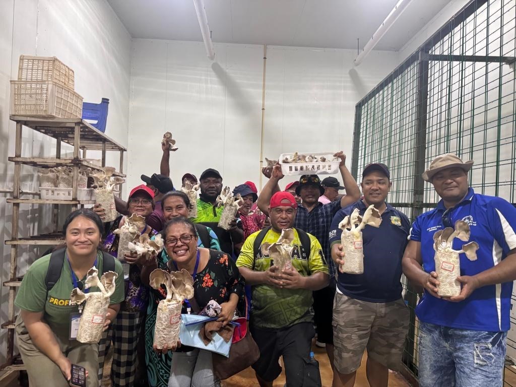 2月28日,在斐濟楠迪,培訓班學員手捧菌草菇合影。新華社發(fā)(中國援斐濟菌草技術示范中心供圖)