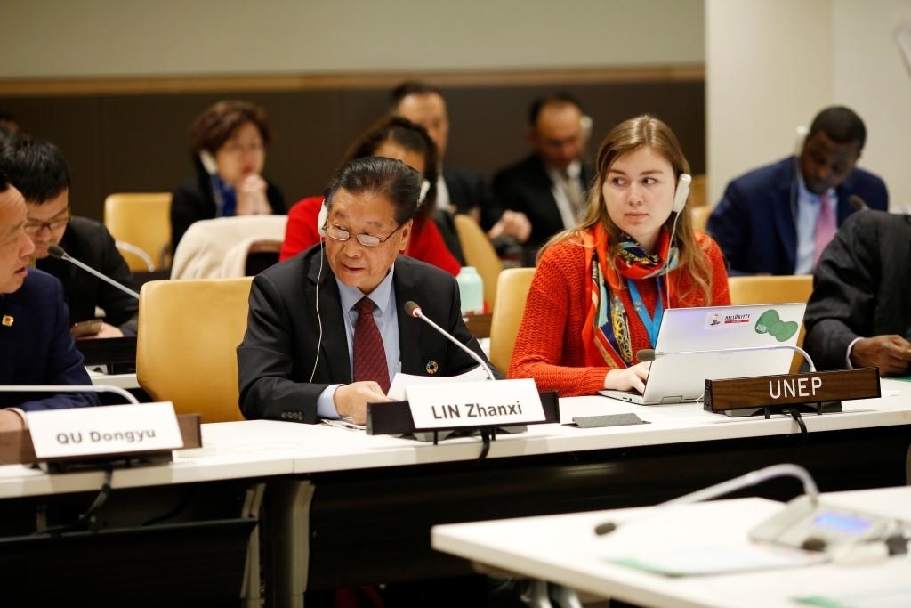 2019年4月18日,在位于紐約的聯(lián)合國總部,林占熺(前排中)在“菌草技術:‘一帶一路’倡議對促進落實聯(lián)合國2030年可持續(xù)發(fā)展議程的實質(zhì)性貢獻”專題研討會上發(fā)言。新華社記者 李木子 攝
