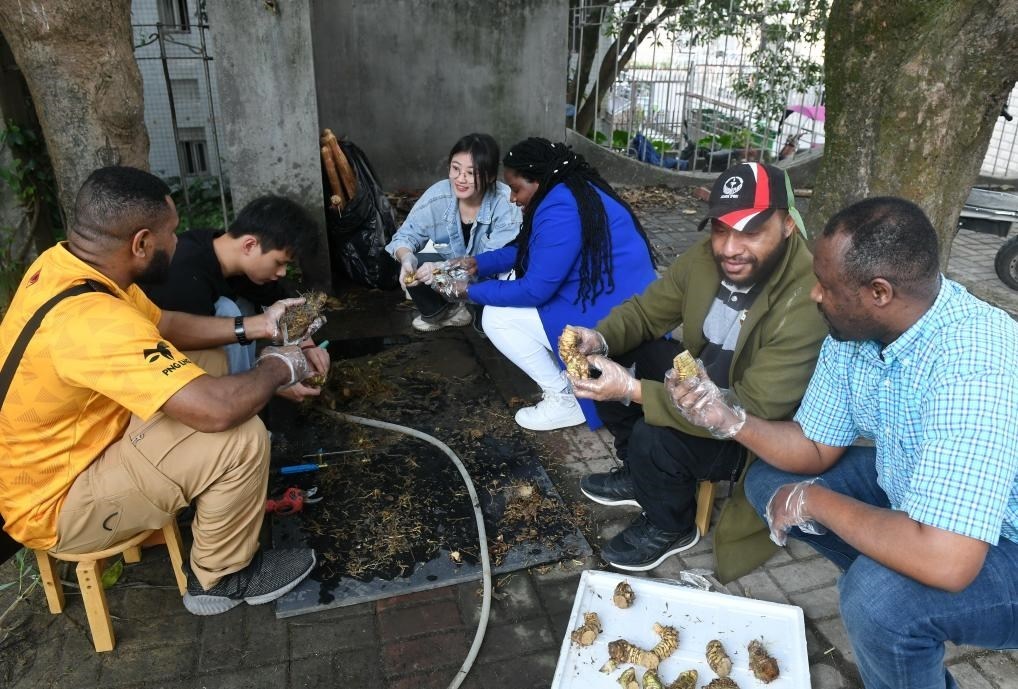 3月28日,在位于福州的福建農(nóng)林大學,來自盧旺達和巴布亞新幾內(nèi)亞的學生與菌草專業(yè)學生交流。新華社記者 林善傳 攝