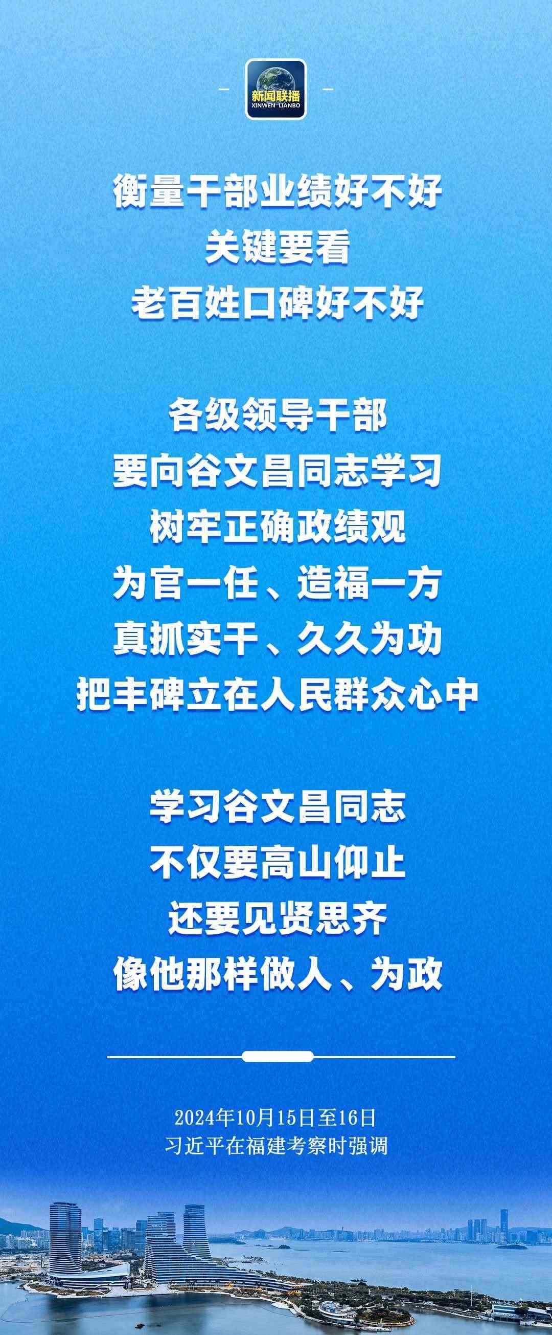 習(xí)近平在谷文昌紀(jì)念館考察時(shí)指出,衡量干部業(yè)績(jī)好不好,關(guān)鍵要看老百姓口碑好不好。各級(jí)領(lǐng)導(dǎo)干部要向谷文昌同志學(xué)習(xí),樹牢正確政績(jī)觀,為官一任、造福一方,真抓實(shí)干、久久為功,把豐碑立在人民群眾心中。學(xué)習(xí)谷文昌同志,不僅要高山仰止,還要見(jiàn)賢思齊,像他那樣做人、為政。