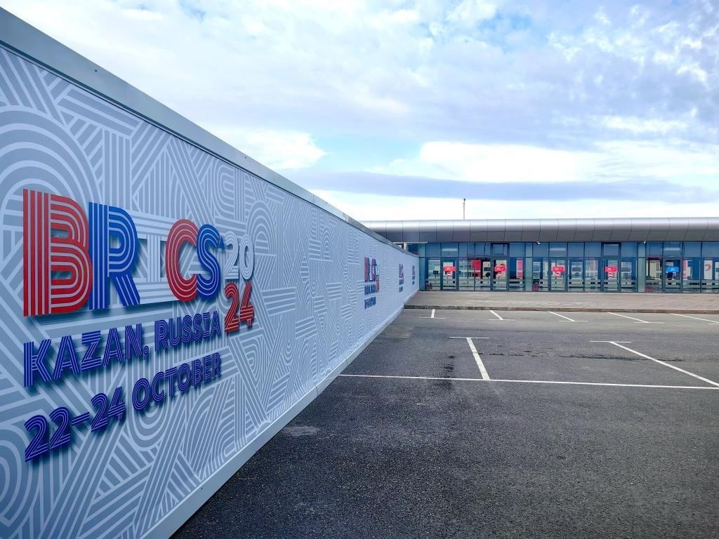 這是2024年10月23日在俄羅斯喀山金磚峰會新聞中心拍攝的金磚峰會標(biāo)識。新華社記者 申宏 攝