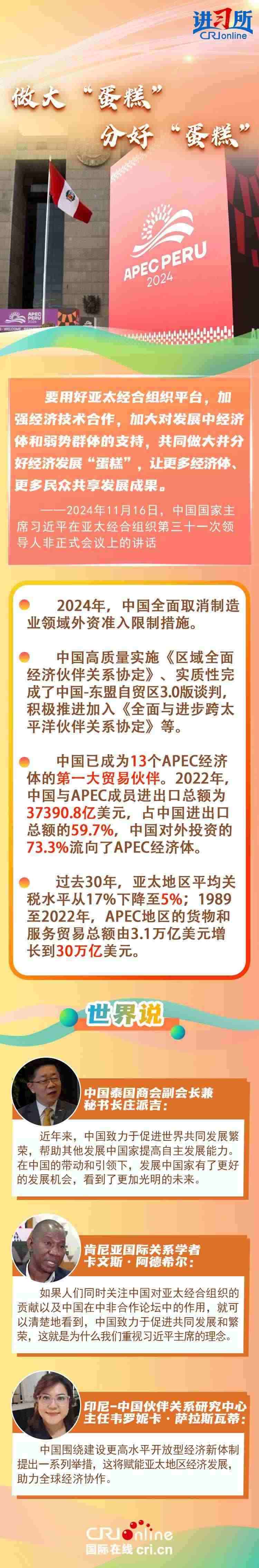 自1991年加入APEC以來,中國(guó)作為關(guān)鍵一員,持續(xù)為亞太地區(qū)成為世界經(jīng)濟(jì)的“火車頭”輸出關(guān)鍵穩(wěn)定力量,習(xí)近平主席表示,“落其實(shí)者思其樹,飲其流者懷其源”。中國(guó)的發(fā)展離不開亞太,也將進(jìn)一步造福亞太。多國(guó)人士表示,在中國(guó)的帶動(dòng)和引領(lǐng)下,發(fā)展中國(guó)家有了更好的發(fā)展機(jī)會(huì),看到了更加光明的未來。