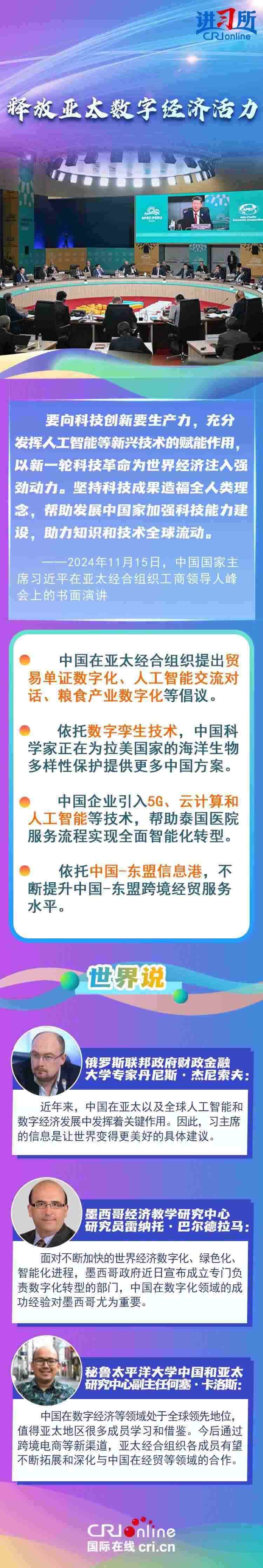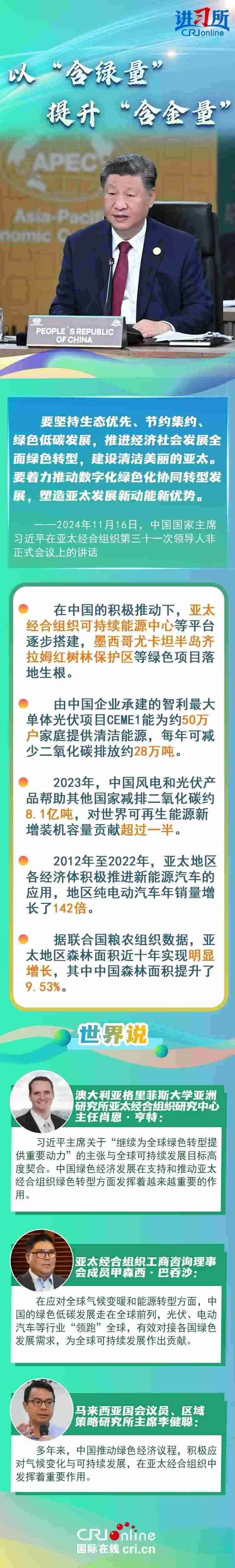 亞太之大,容得下大家共同發(fā)展。當(dāng)前單邊主義、保護(hù)主義蔓延,世界經(jīng)濟(jì)正經(jīng)受逆水行舟、不進(jìn)則退的嚴(yán)峻考驗(yàn)。習(xí)近平主席從促進(jìn)亞太合作大局出發(fā),圍繞“綠色”“創(chuàng)新”“普惠包容”等議題,闡釋中國(guó)行動(dòng),強(qiáng)調(diào)要守正創(chuàng)新,擦亮開放亞太、包容亞太的金字招牌,打造綠色亞太、數(shù)字亞太的新招牌,推動(dòng)構(gòu)建亞太命運(yùn)共同體。