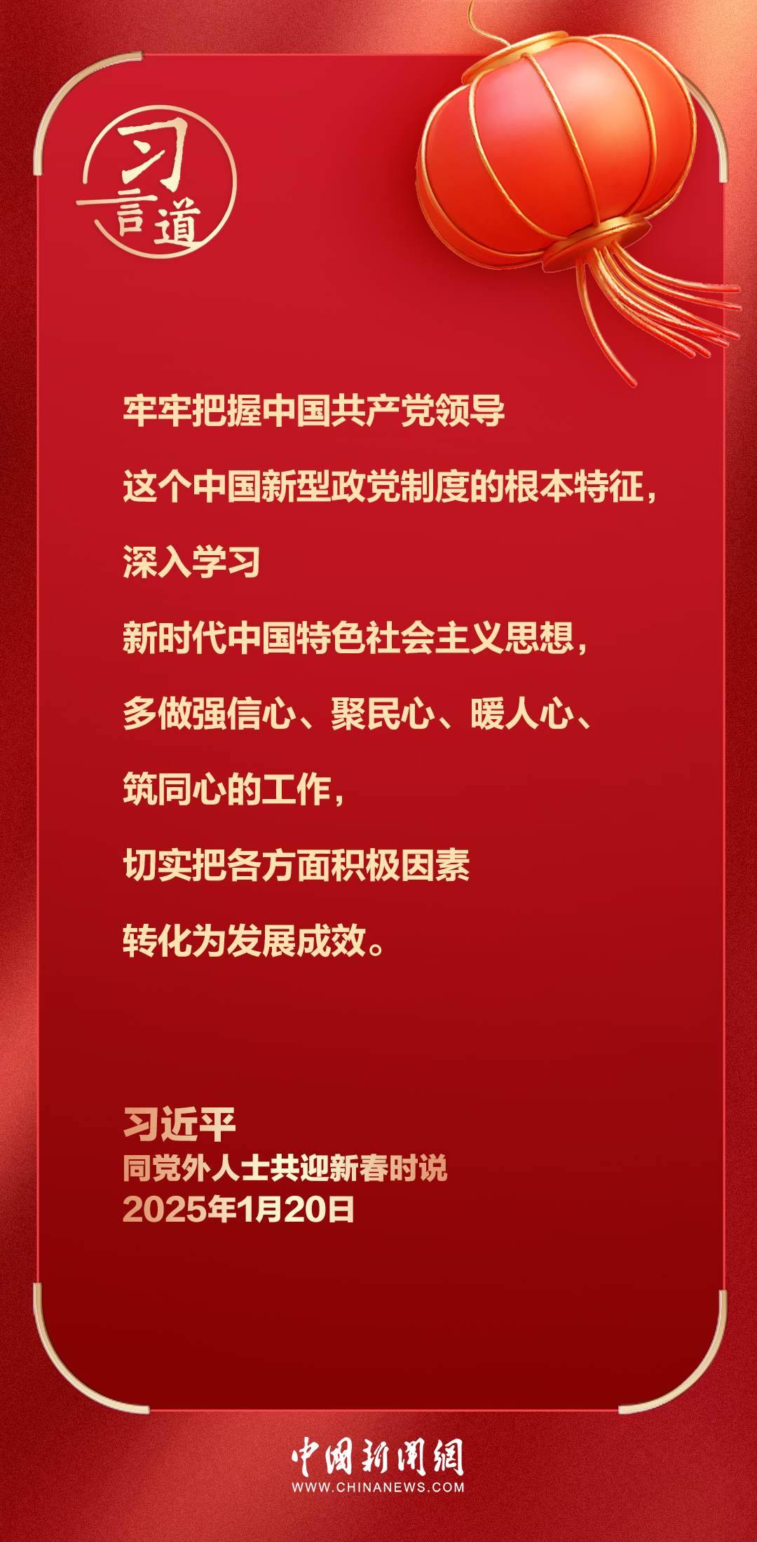 在中華民族傳統(tǒng)節(jié)日乙巳蛇年春節(jié)即將到來之際,中共中央總書記、國家主席、中央軍委主席習(xí)近平20日在人民大會堂同各民主黨派中央、全國工商聯(lián)負責人和無黨派人士代表歡聚一堂,共迎佳節(jié)。習(xí)近平代表中共中央,向各民主黨派、工商聯(lián)和無黨派人士,向統(tǒng)一戰(zhàn)線廣大成員,致以誠摯問候和新春祝福。