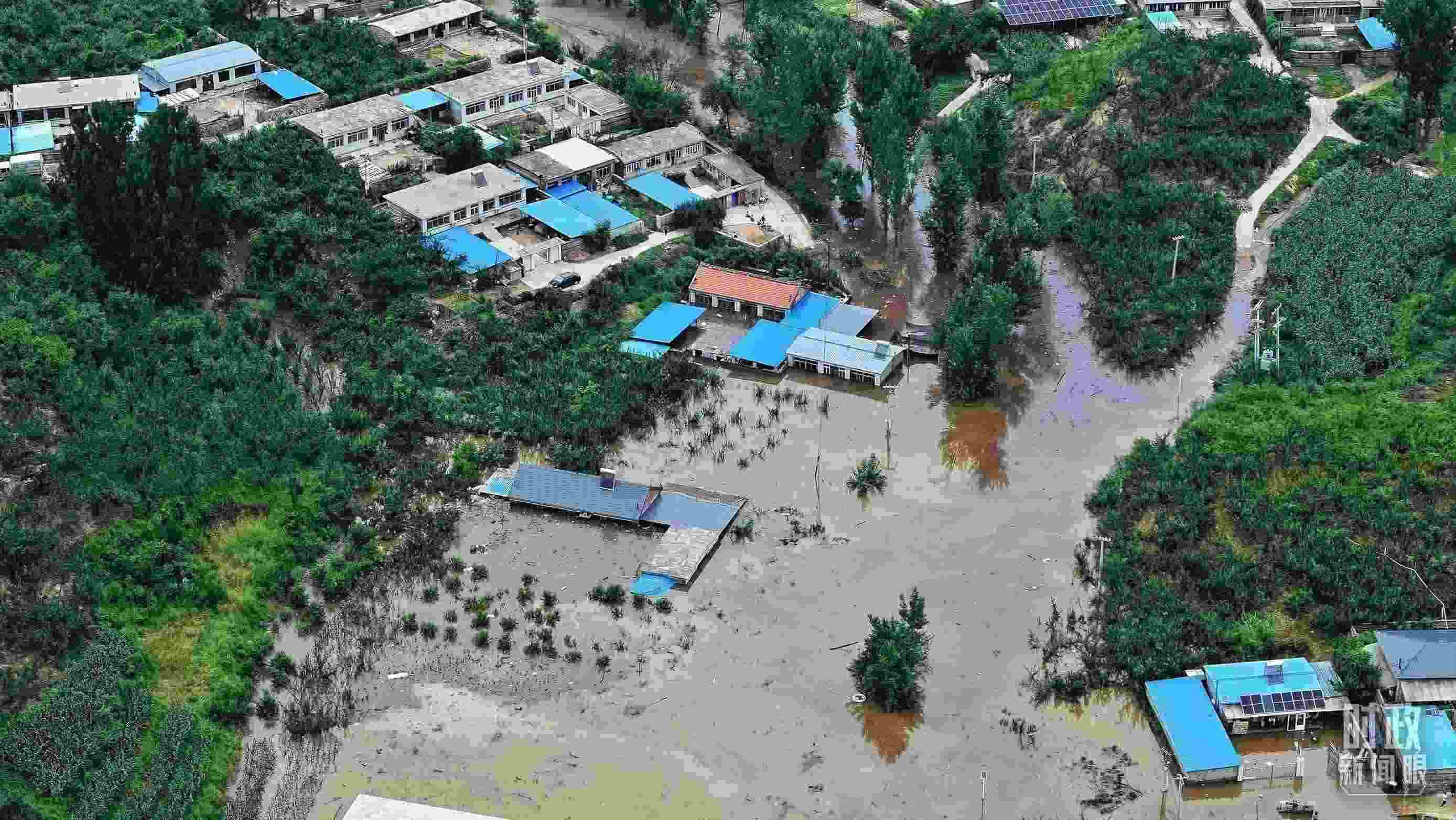 △被洪水淹沒(méi)的祝家溝村。
