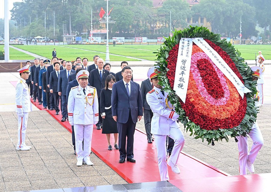2023年,習(xí)近平總書(shū)記在訪(fǎng)越期間來(lái)到巴亭廣場(chǎng),沿著載有無(wú)數(shù)歷史印記的石板路,前往胡志明陵敬獻(xiàn)花圈,追思緬懷。