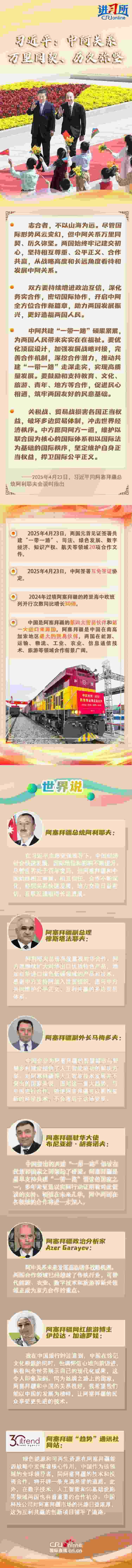 4月23日,中國國家主席習(xí)近平在北京同阿塞拜疆總統(tǒng)阿利耶夫舉行會談。兩國元首宣布,建立中阿全面戰(zhàn)略伙伴關(guān)系。習(xí)近平指出,盡管國際形勢風(fēng)云變幻,但中阿關(guān)系萬里同契、歷久彌堅。雙方要持續(xù)增進(jìn)政治互信,深化務(wù)實合作,密切國際協(xié)作,開啟中阿全方位合作新篇章,助力兩國發(fā)展振興,更好造福兩國人民。