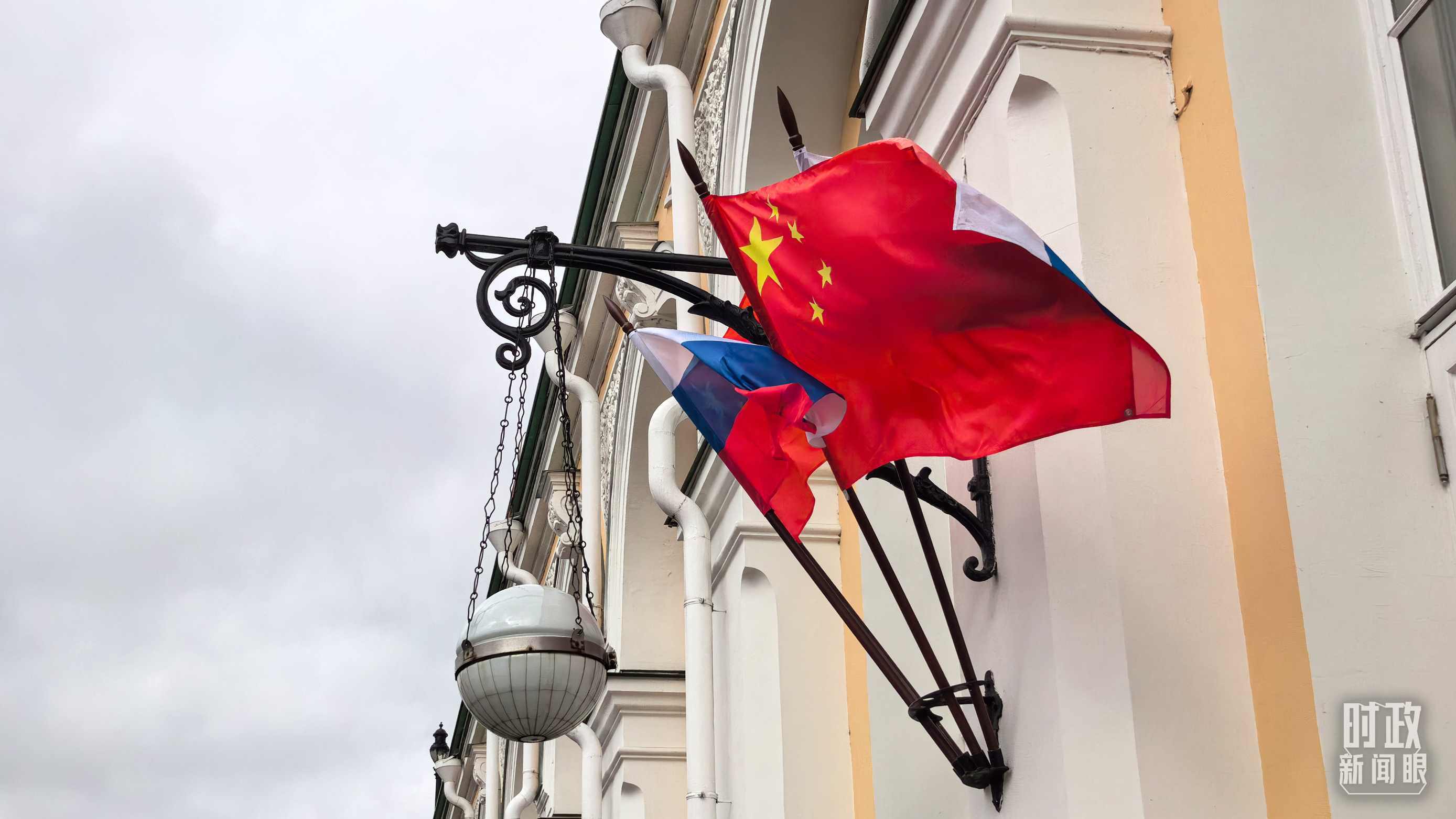 △下車(chē)處懸掛的中俄兩國(guó)國(guó)旗。(總臺(tái)央視記者劉琦拍攝)
