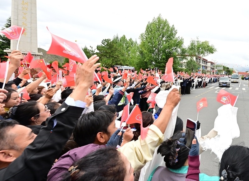8月20日中午,中共中央總書記、國家主席、中央軍委主席習近平率中央代表團乘專機抵達拉薩,出席西藏自治區(qū)成立60周年慶?;顒?。習近平等從機場乘車到住地途中,各族群眾在街道兩旁熱情歡迎。