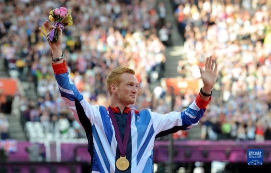 2012年8月5日,英國選手盧瑟福德在2012年倫敦奧運會田徑男子跳遠決賽頒獎儀式上。新華社記者 楊磊 攝