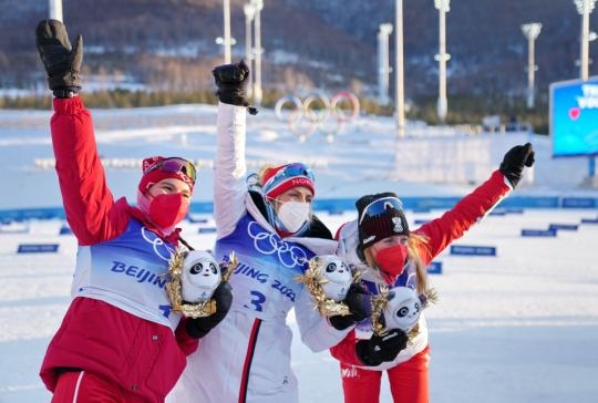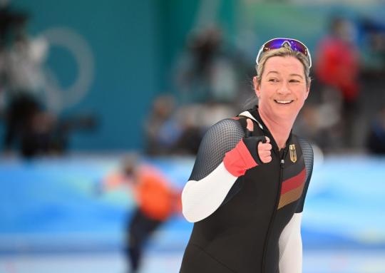 沖過(guò)速度滑冰女子3000米終點(diǎn)線(xiàn)時(shí)