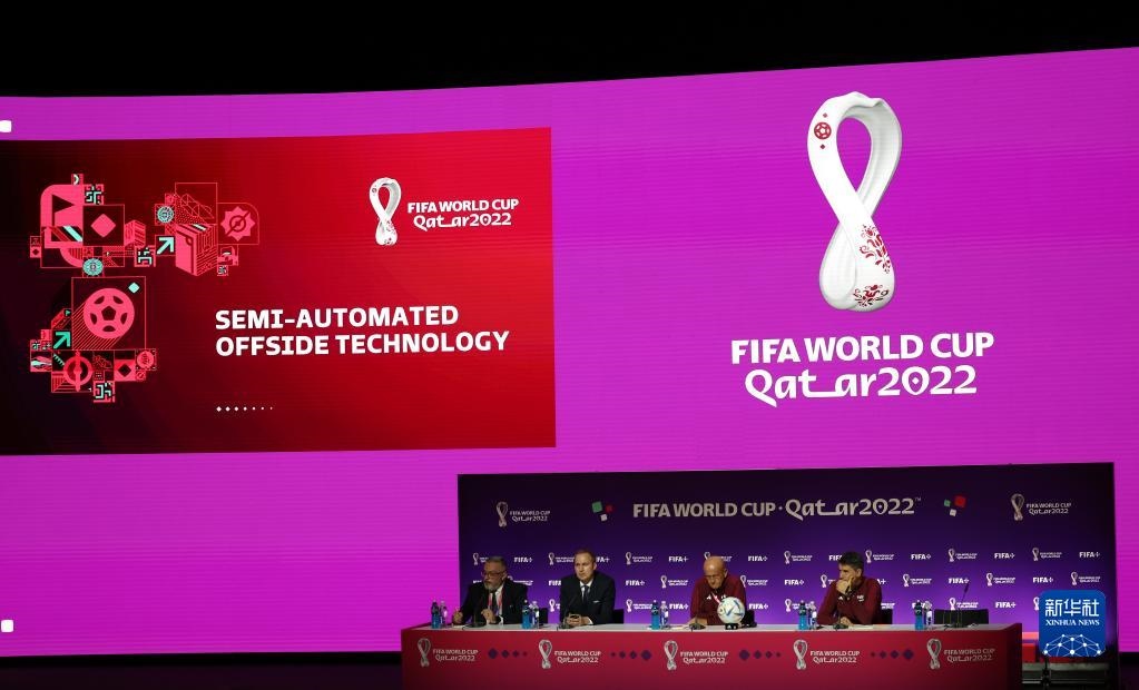 11月18日,國(guó)際足聯(lián)足球技術(shù)與創(chuàng)新總監(jiān)霍爾茲穆勒(左二)在通氣會(huì)上介紹半自動(dòng)越位識(shí)別技術(shù)。新華社記者 賈浩成 攝