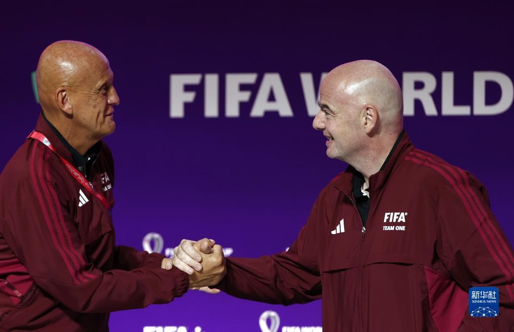 11月18日,國(guó)際足聯(lián)主席因凡蒂諾(右)與國(guó)際足聯(lián)裁判委員會(huì)主席皮耶路易吉·科利納在通氣會(huì)上握手致意。新華社記者 賈浩成 攝