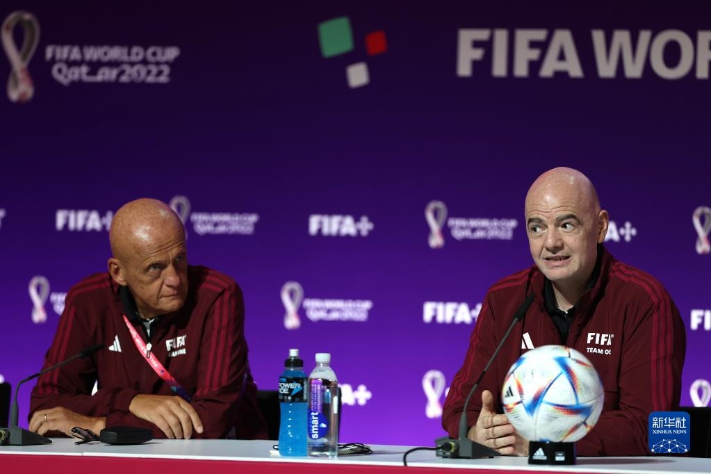 11月18日,國(guó)際足聯(lián)主席因凡蒂諾(右)與國(guó)際足聯(lián)裁判委員會(huì)主席皮耶路易吉·科利納在通氣會(huì)上。新華社記者 賈浩成 攝
