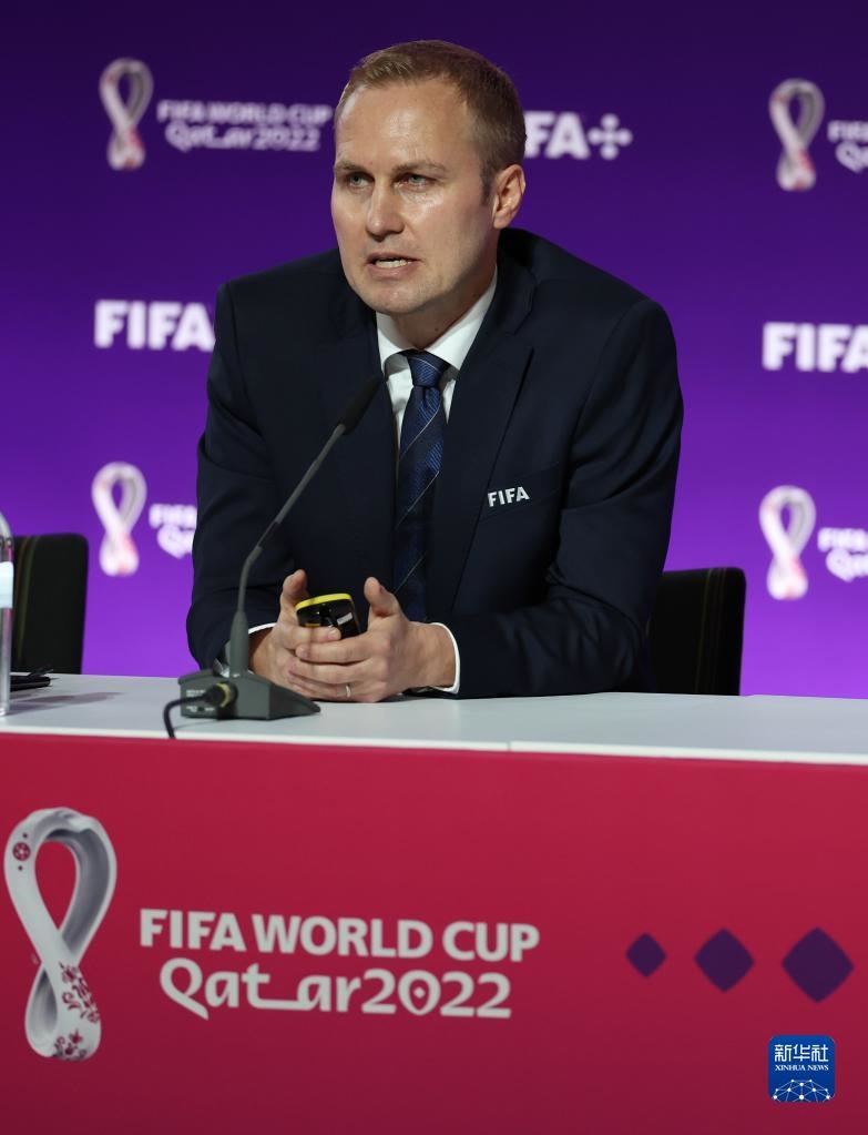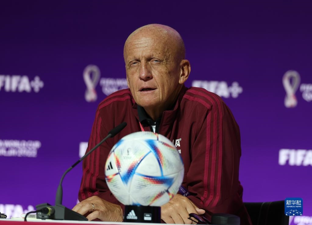 11月18日,國(guó)際足聯(lián)裁判委員會(huì)主席皮耶路易吉·科利納在通氣會(huì)上。新華社記者 賈浩成 攝
