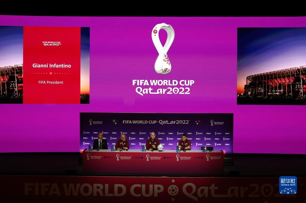 11月18日,國(guó)際足聯(lián)主席因凡蒂諾(右二)在通氣會(huì)上發(fā)言。新華社記者 賈浩成 攝