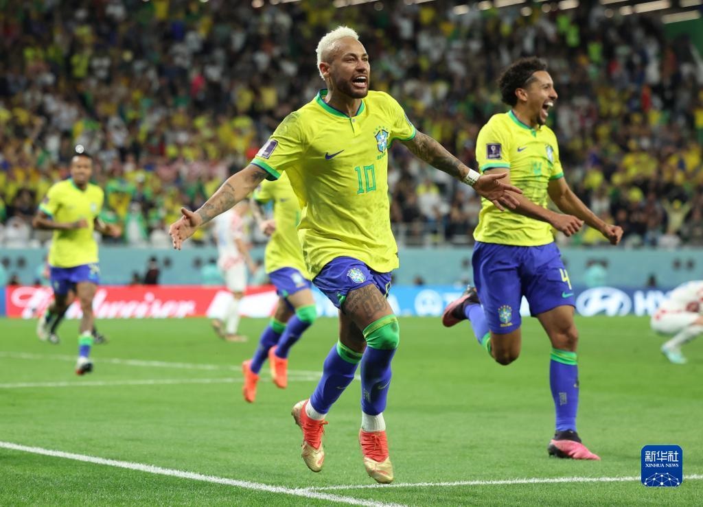 12月9日,巴西隊球員內(nèi)馬爾(右二)在比賽中突破克羅地亞隊守門員利瓦科維奇(右三)的防守后射門得分。新華社記者 蘭紅光 攝