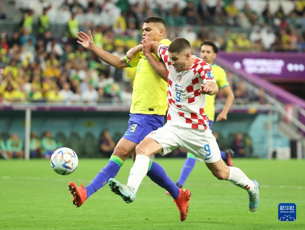 12月9日,巴西隊球員蒂亞戈·席爾瓦(左)與克羅地亞隊球員克拉馬里奇在比賽中拼搶。新華社記者 韓巖 攝