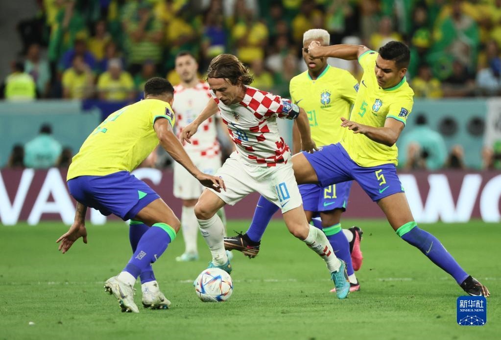 12月9日,克羅地亞隊球員莫德里奇(左二)與巴西隊球員卡塞米羅(右一)在比賽中拼搶。新華社記者 蘭紅光 攝