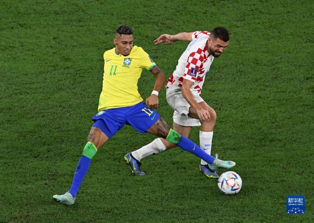 12月9日,巴西隊球員拉菲尼亞(左)與克羅地亞隊球員科瓦契奇在比賽中拼搶。新華社記者 夏一方 攝