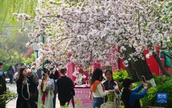 3月21日,在濟(jì)南市五龍?zhí)豆珗@,人們?cè)谟^賞盛開的海棠花。