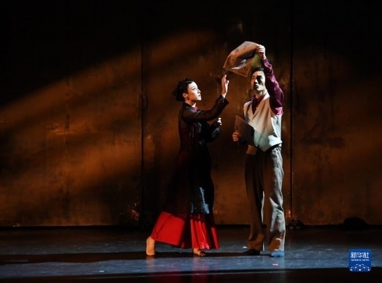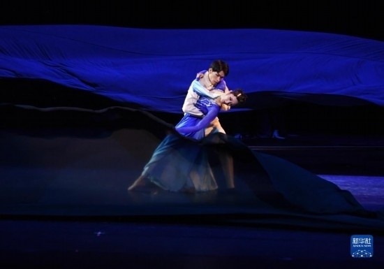 4月3日,演員在舞劇《藍色裙擺》中表演。