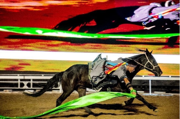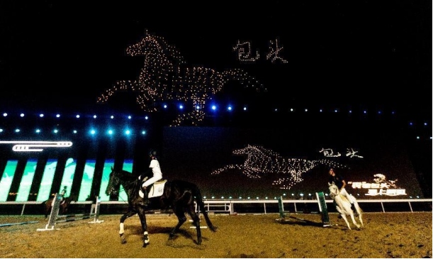開幕式文體表演由《馬術(shù)方陣一馬當(dāng)先》、歌伴舞《我的城我的馬》、《名馬展示策馬揚鞭》、《單馬技巧雙翼神馬》、《馬障礙秀躍馬揚鞭》、《馬術(shù)秀人馬合一》、歌伴舞《騎跡包頭》、《無人機(jī)秀馬上精彩》八塊內(nèi)容組成。當(dāng)晚的賽汗塔拉馬術(shù)賽場流光溢彩、氣氛熱烈,場內(nèi)座無虛席、歡聲雷動。20時30分許,主騎手手持國旗,副騎手手持馬城旗幟,運動員方陣、民族方陣、女騎方陣、馬主方陣入場,騎手們精神飽滿、英姿颯爽,不時揮手致意,現(xiàn)場觀眾用熱烈的掌聲和歡呼聲,歡迎他們的到來。達(dá)茂旗9歲賽馬冠軍阿茹樂手持彩旗引出世界名馬亮相,40對人馬合一的“千古馬頌”表演震撼全場,1000架無人機(jī)躍然天空,點亮“騎跡包頭 馬上精彩”的字樣……藍(lán)天、碧水、凈土的包頭在策馬奔騰的馬術(shù)競技中拉開了“中國馬城”的壯麗畫卷。