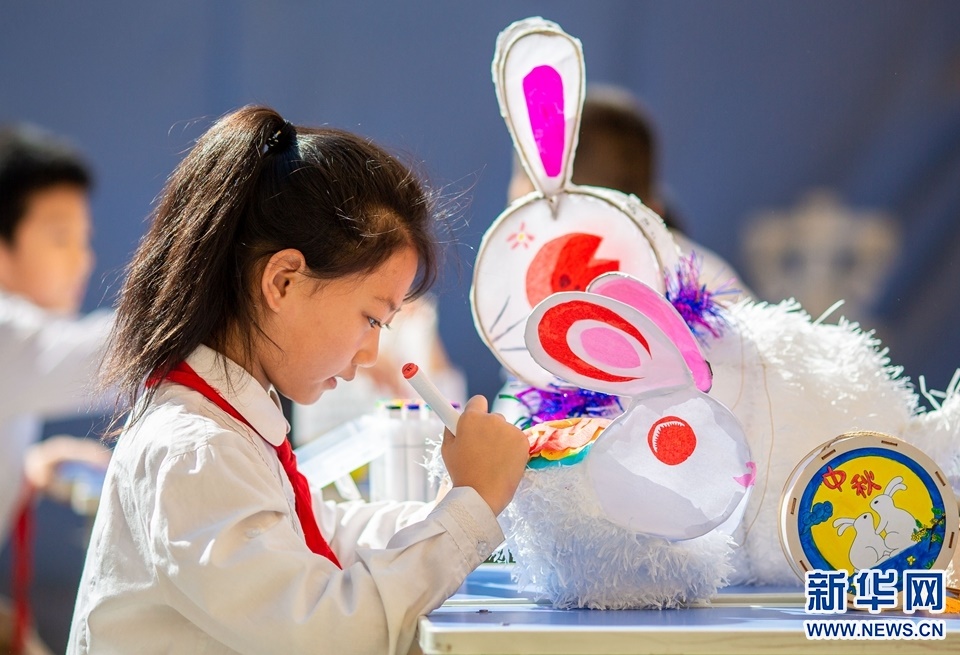 9月7日,呼和浩特市玉泉區(qū)恒昌店巷小學(xué)學(xué)生在繪制玉兔花燈。新華網(wǎng)發(fā)(丁根厚攝)