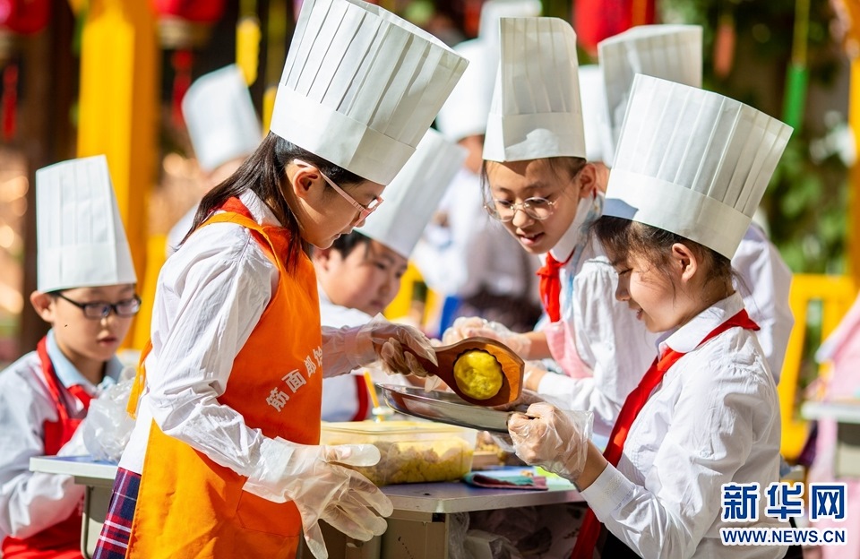 9月7日,呼和浩特市玉泉區(qū)恒昌店巷小學(xué)學(xué)生在學(xué)習(xí)做月餅。新華網(wǎng)發(fā)(丁根厚攝)
