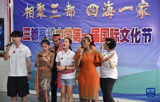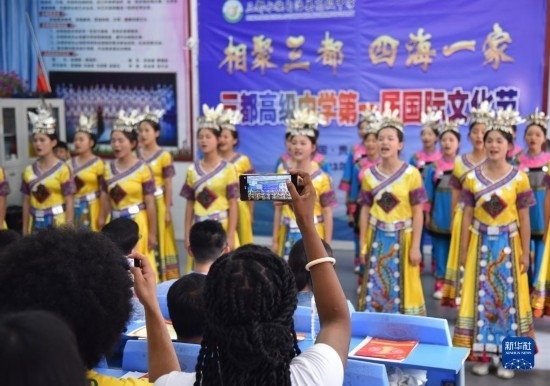 6月5日,來(lái)華留學(xué)生在三都高級(jí)中學(xué)第一屆國(guó)際文化節(jié)上演唱歌曲。