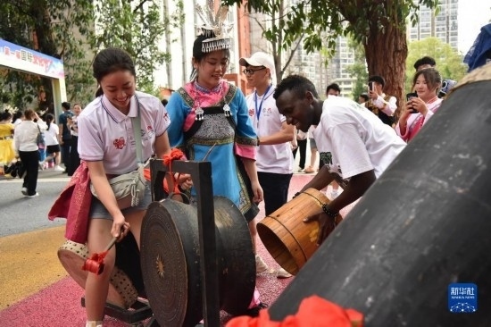 6月5日,參加三都高級(jí)中學(xué)第一屆國(guó)際文化節(jié)的來(lái)華留學(xué)生體驗(yàn)敲擊銅鼓。