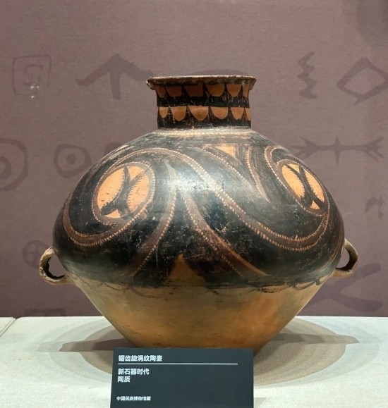鋸齒旋渦紋陶壺 新石器時(shí)代 中國(guó)民族博物館藏。(民族畫(huà)報(bào)記者 鷹鴿 攝)