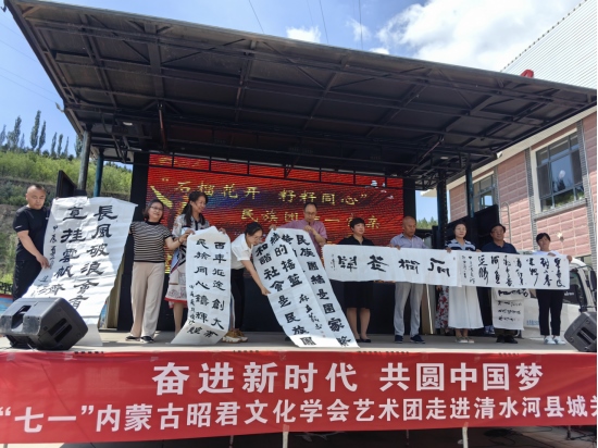 據(jù)了解,本次進(jìn)社區(qū)活動(dòng)由內(nèi)蒙古昭君文化學(xué)會(huì)、清水河縣城關(guān)鎮(zhèn)政府、昆新社區(qū)主辦,活動(dòng)以“鑄牢中華民族共同體意識(shí),構(gòu)筑中華民族共有精神家園”和慶祝中國(guó)共產(chǎn)黨建黨103周年為主旨,以書法、歌舞等群眾喜聞樂見的藝術(shù)形式,歌頌中國(guó)共產(chǎn)黨帶領(lǐng)全國(guó)各族人民守望相助、團(tuán)結(jié)奮斗砥礪前行的光輝歷程以及取得的偉大成就,真情詮釋不忘初心,牢記使命的責(zé)任擔(dān)當(dāng)。