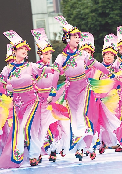 在四川省北川羌族自治縣新生廣場,羌族學生跳沙朗舞歡慶羌歷新年。