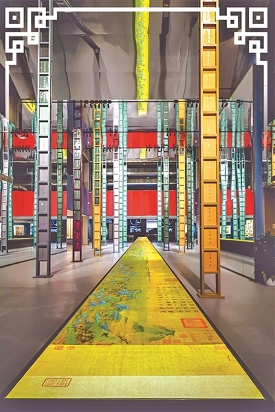 走進(jìn)展廳,墨綠色、宮墻紅、灰藍(lán)色不一的墻面上,懸掛著用淺色木框裝裱的繪畫展品,素淡清雅,古韻悠然。展廳中間,《千里江山圖》高清打樣稿鋪展開(kāi)來(lái),如同一條流淌的青綠長(zhǎng)河。放大兩倍后,畫中各種各樣的漁舟、山石的皴法依然清晰可辨。