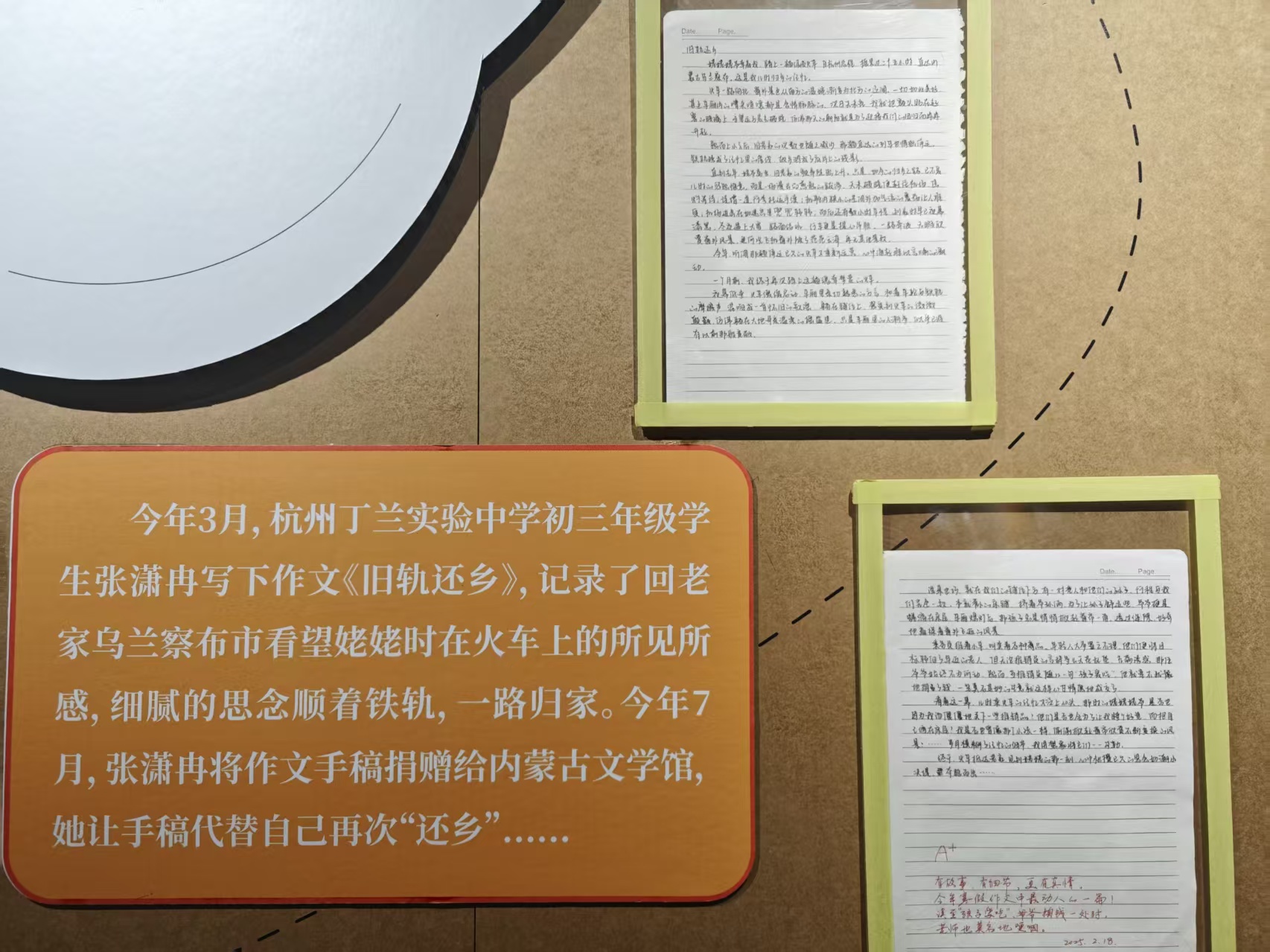 值得一提的是,憑借作文《舊軌還鄉(xiāng)》引起網(wǎng)友廣泛關(guān)注和共鳴的內(nèi)蒙古籍女孩張瀟冉,今年7月將手稿捐贈給了內(nèi)蒙古文學(xué)館,本次展覽對《舊軌還鄉(xiāng)》手稿進行展出。展覽還展出了生于2007年的少女詩人姜二嫚的詩作,年少成名的姜二嫚用7歲時所作的《光》向全國小詩人們送上問候。