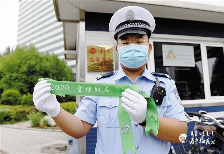 7月5日,呼和浩特市交警支隊賽罕大隊二中隊民警正在展示綠絲帶。為確保接送考生的車輛不被堵在路上影響考試,呼市交管支隊制作了25000條綠絲帶,家長或考生可以去市區(qū)考場附近的交警崗亭免費領取,“綠絲帶”要掛在機動車左側的后視鏡上。(內(nèi)蒙古日報記者 孟和朝魯 攝)