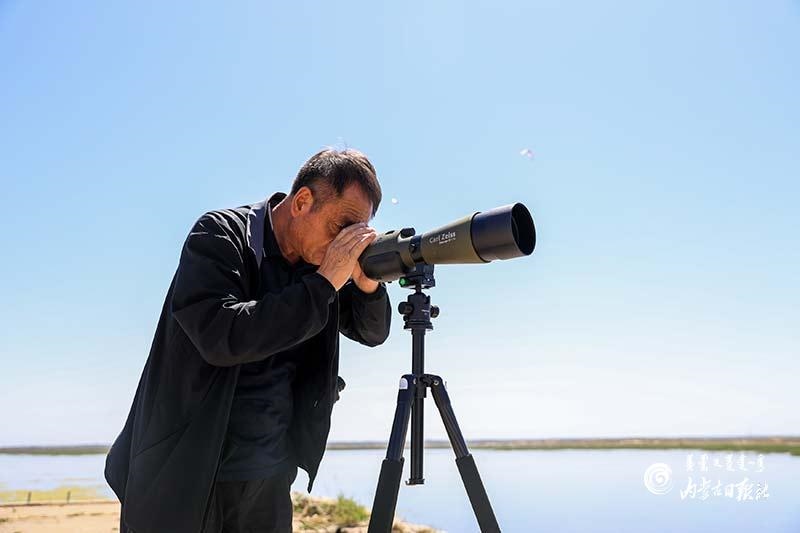 烈日下 ,通過高倍望 遠(yuǎn)鏡觀察鳥類活動(dòng)情況。
