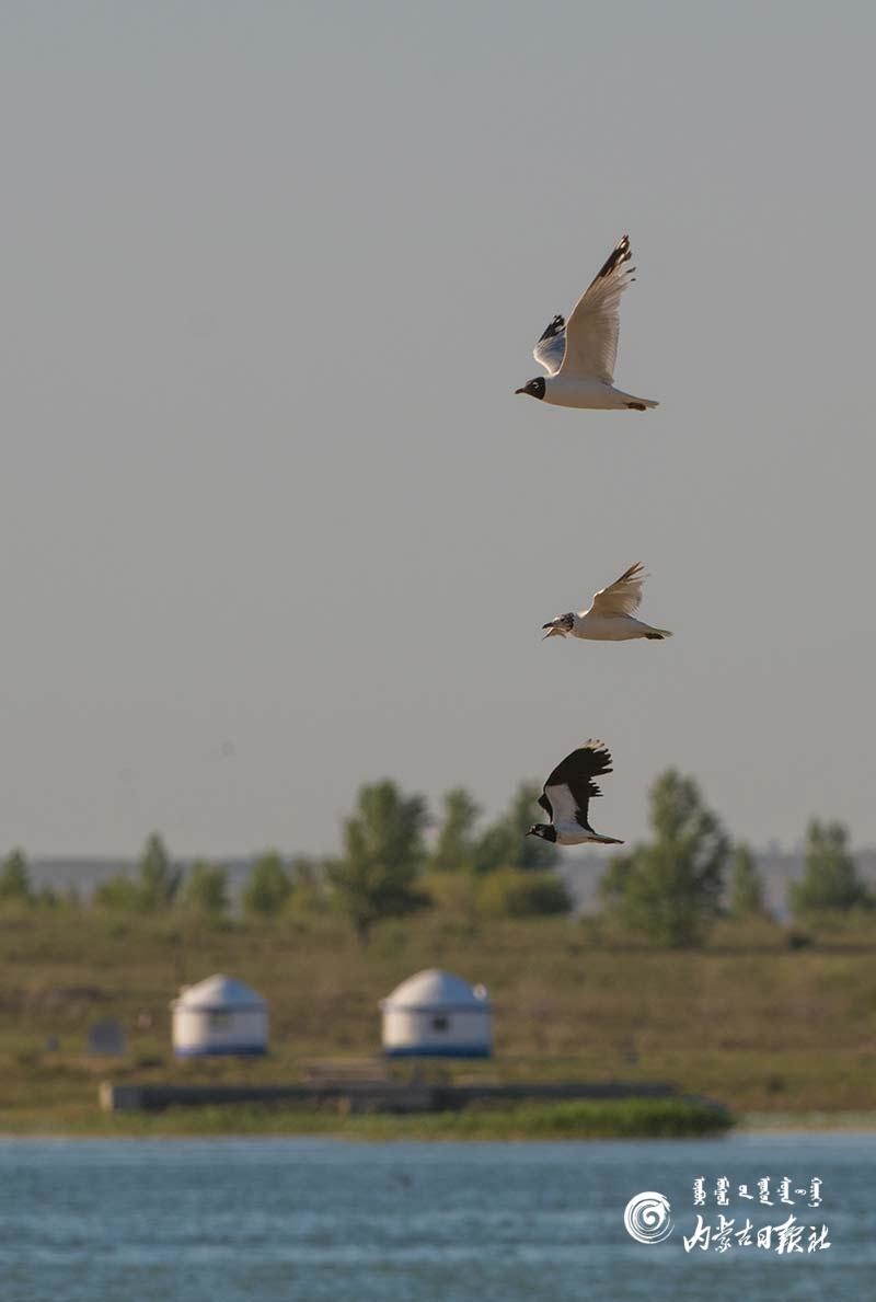 遺鷗掠過水面,與遠(yuǎn)處的蒙古包相映成趣。