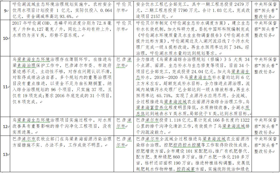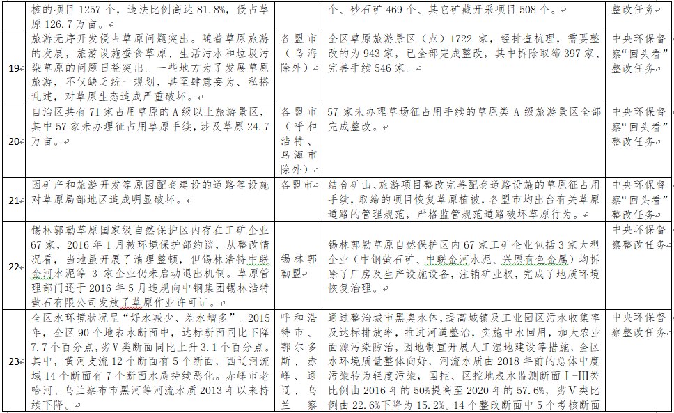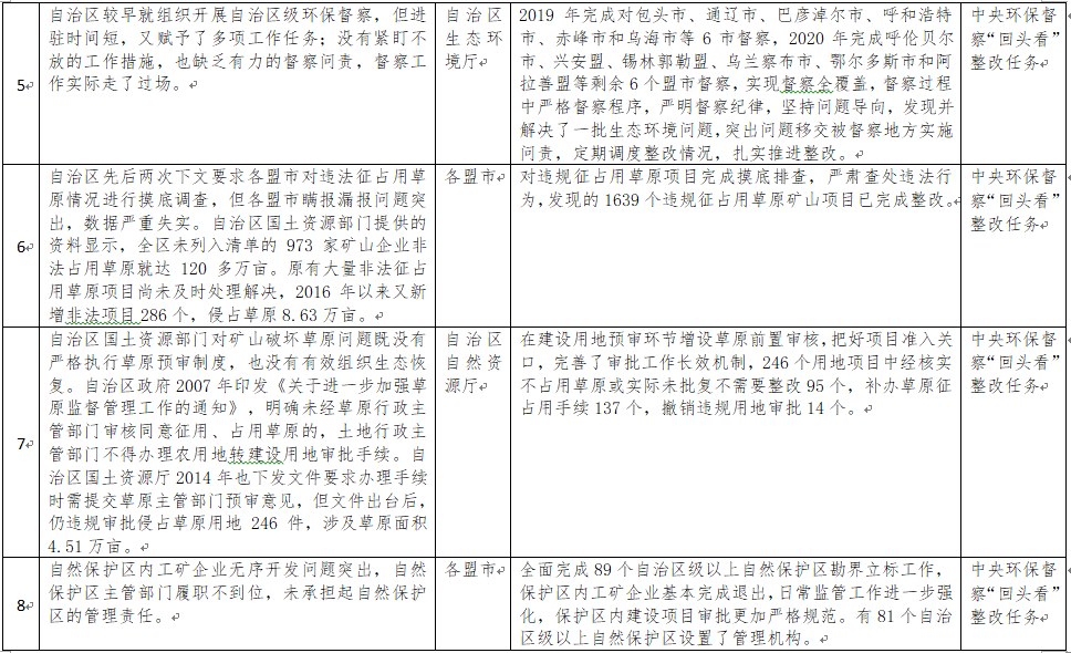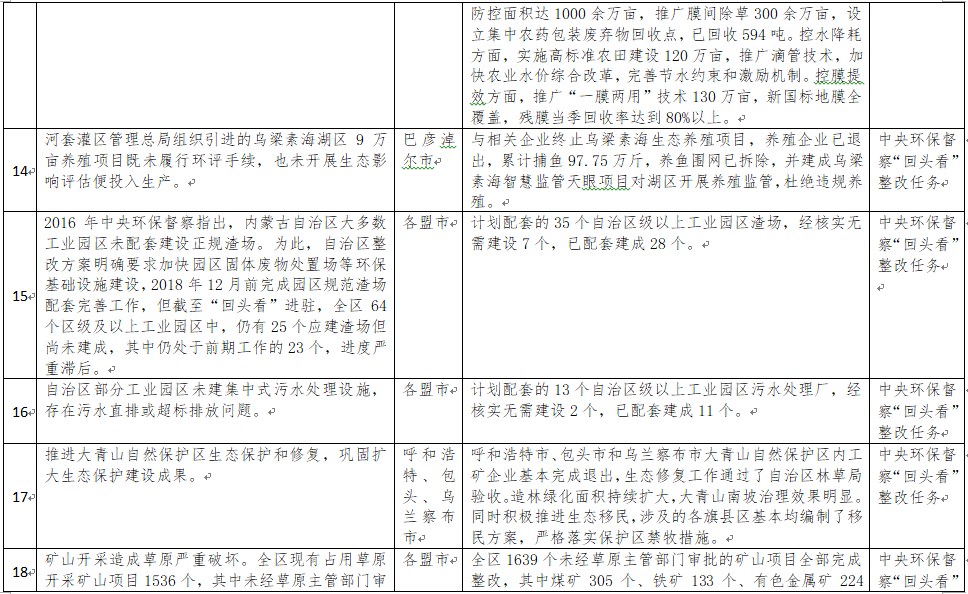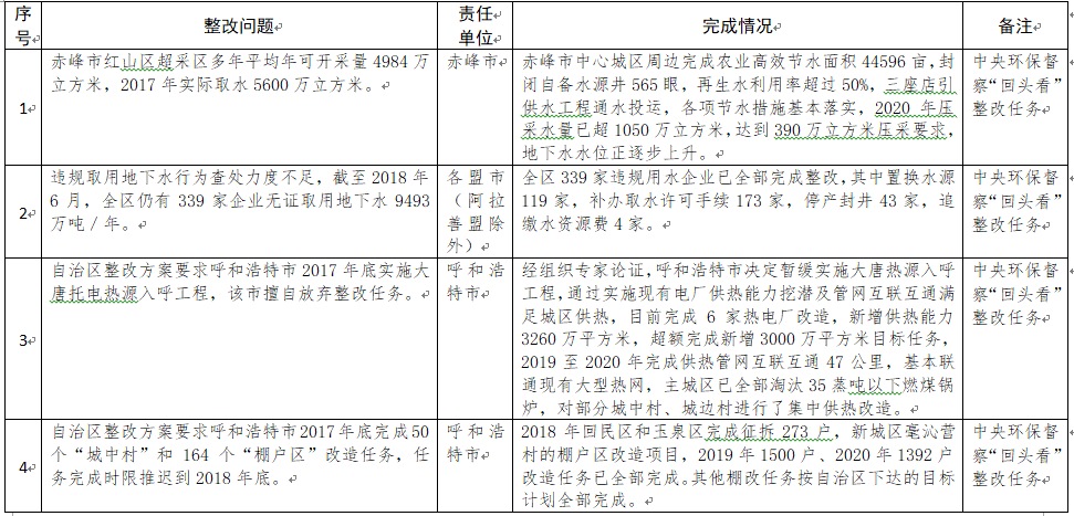 中央環(huán)境保護(hù)督察以來,自治區(qū)各級黨委政府及相關(guān)部門高度重視反饋意見整改工作,貫徹落實習(xí)近平生態(tài)文明思想的自覺性和主動性顯著增強,采取強有力措施積極推動整改工作,整改工作取得階段性成果。近期部分整改任務(wù)已通過自治區(qū)相關(guān)委辦廳局驗收,現(xiàn)予以公示,公示期2021年2月5日至2月9日,未提出異議的整改任務(wù)給予銷號(聯(lián)系電話:0471-4632171)。
