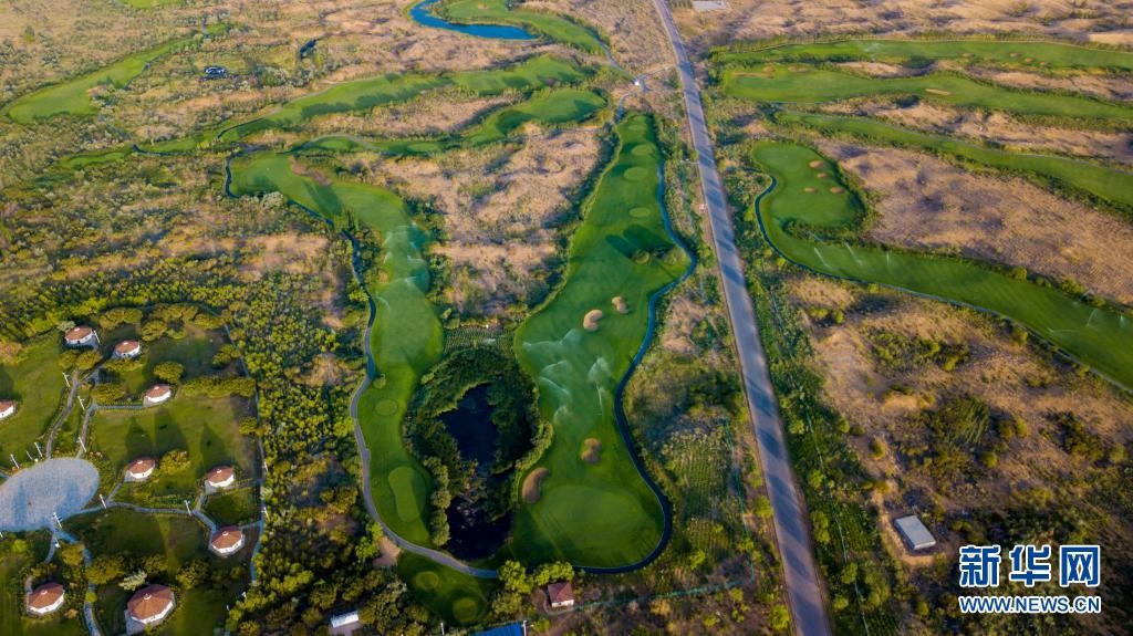 這是位于庫布其沙漠中的七星湖景區(qū)(2018年7月11日攝,無人機照片)。新華社記者 彭源 攝